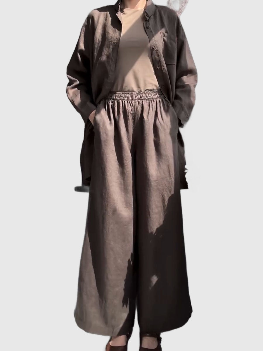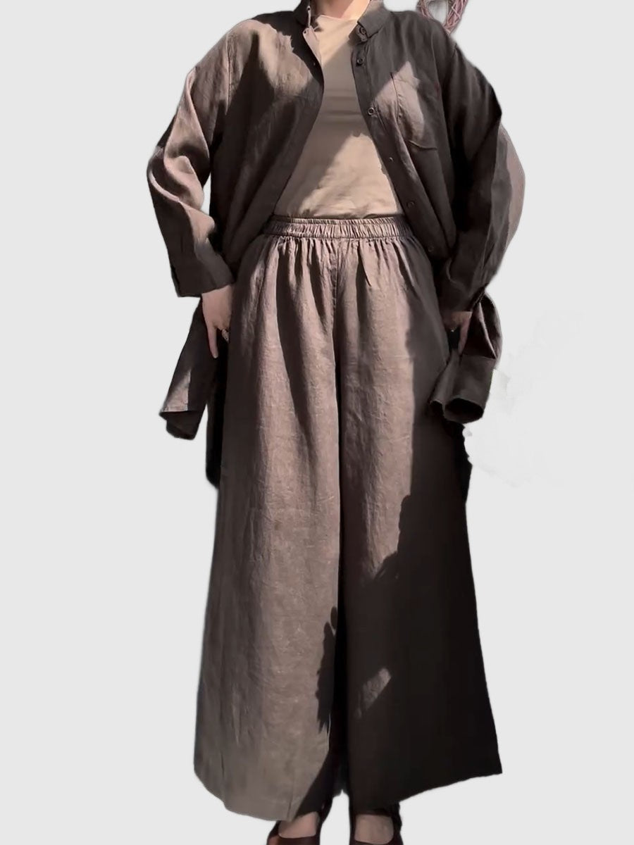חולצה משוחררת ומכנסי פשתן רחבים יוצרים מראה אלגנטי, נקי ונטול מאמץ. בדיוק מה שאת צריכה כדי לעבור בקלות מבוקר רגוע לאירוע ערב מלא סטייל.
