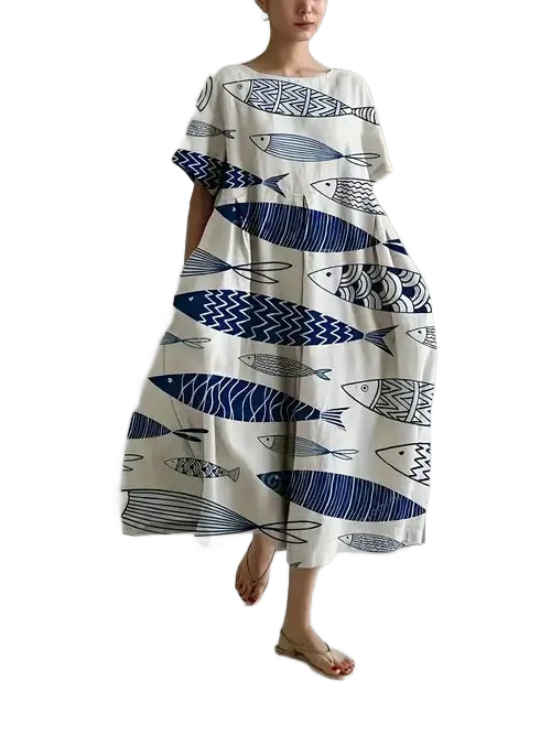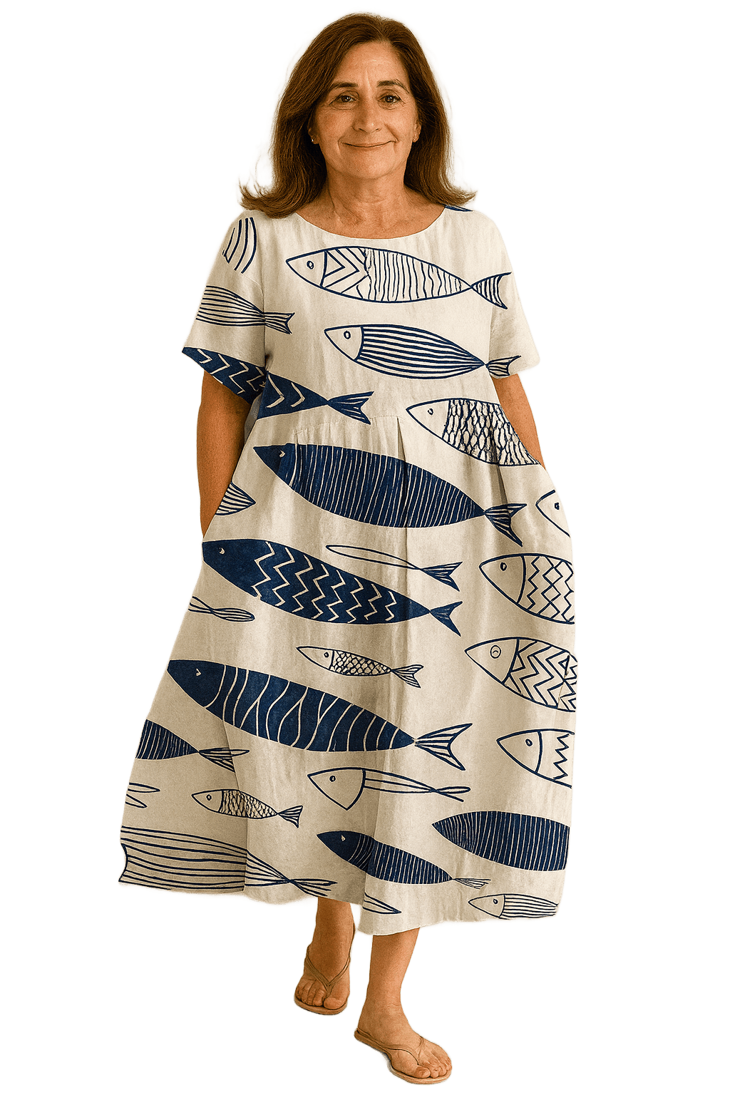 השמלה המושלמת לימים חמים ולטיולים על החוף! Amar™ Eliora משלבת דפוס דגים משמח עם חתך רחב ונוח, כך שתרגישי קלילה, חופשייה ומלאת חיים. הצווארון העגול והאריג הנעים מבטיחים נוחות מקסימלית לאורך כל היום, והעיצוב הייחודי יהפוך כל הלוק שלך למלא הבעה. מושלם לבילויים קיציים, טיולים או סתם ליהנות מהשמש!