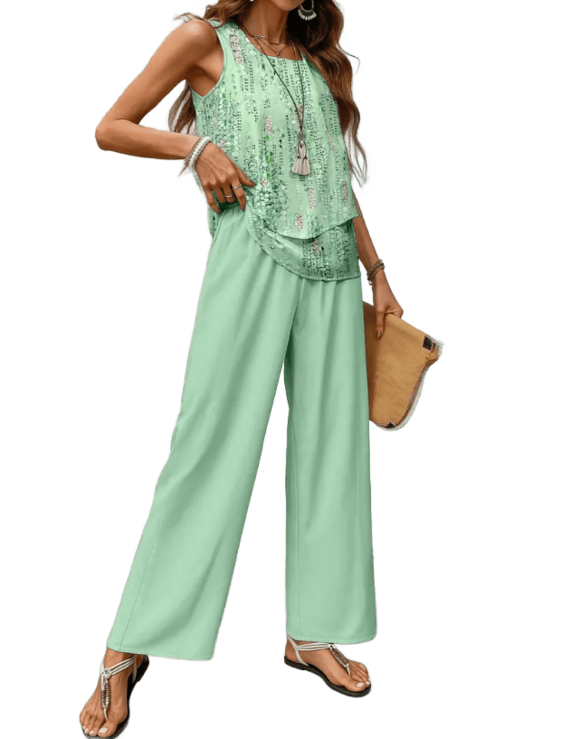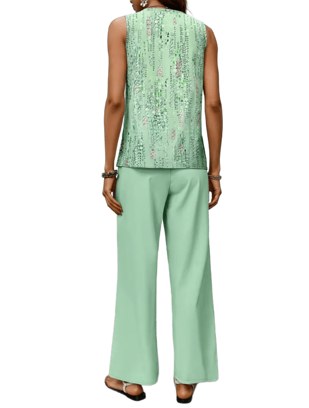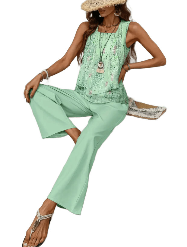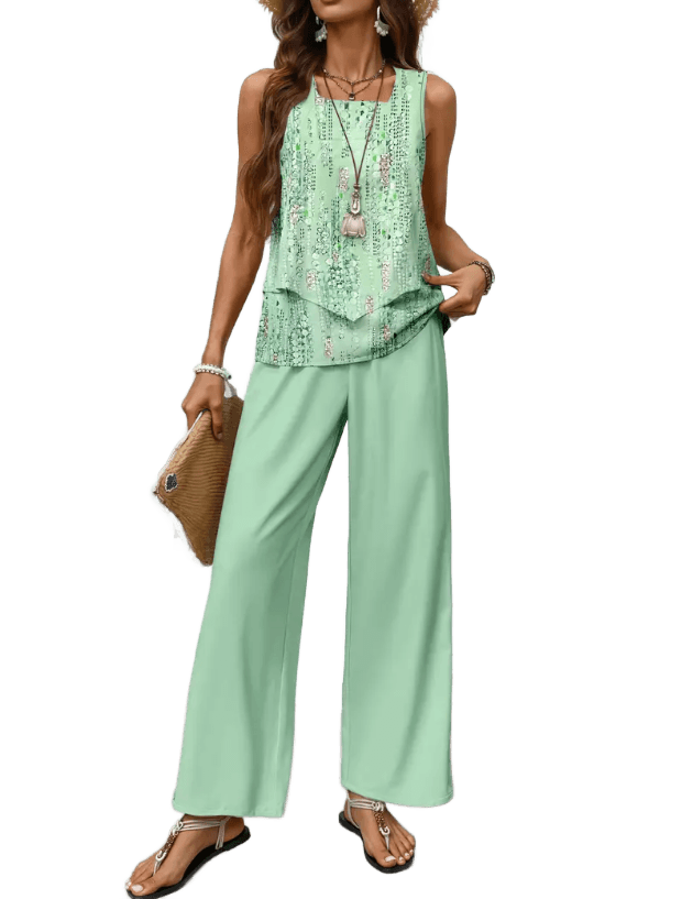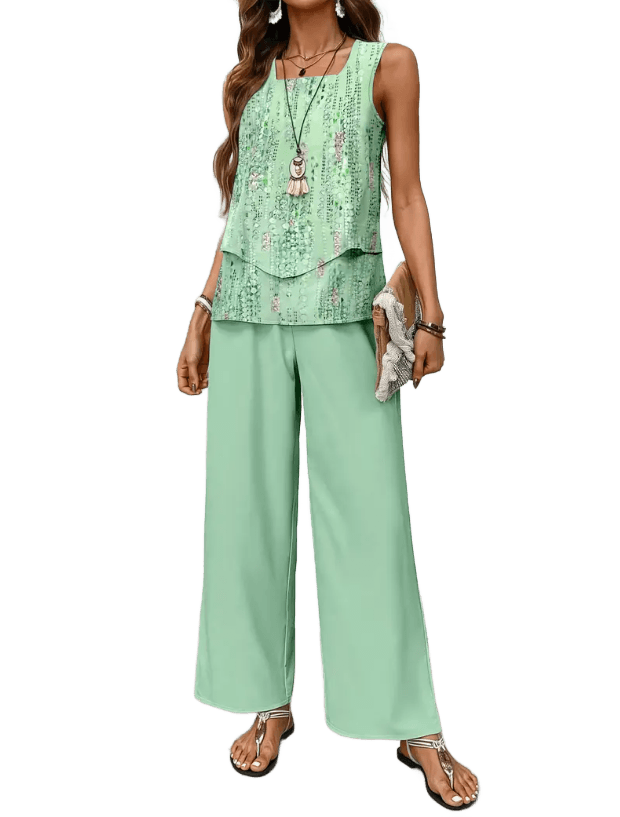 החולצה מעט ארוכה, עם גזרה מחמיאה שיורדת בעדינות על המותניים, והמכנסיים רחבים בדיוק במידה, כאלה שזזים איתך – בבית, בטיול, בפגישה עם חברה. צבעים נעימים, הדפס עדין שנראה יוקרתי אבל לא מתאמץ.
