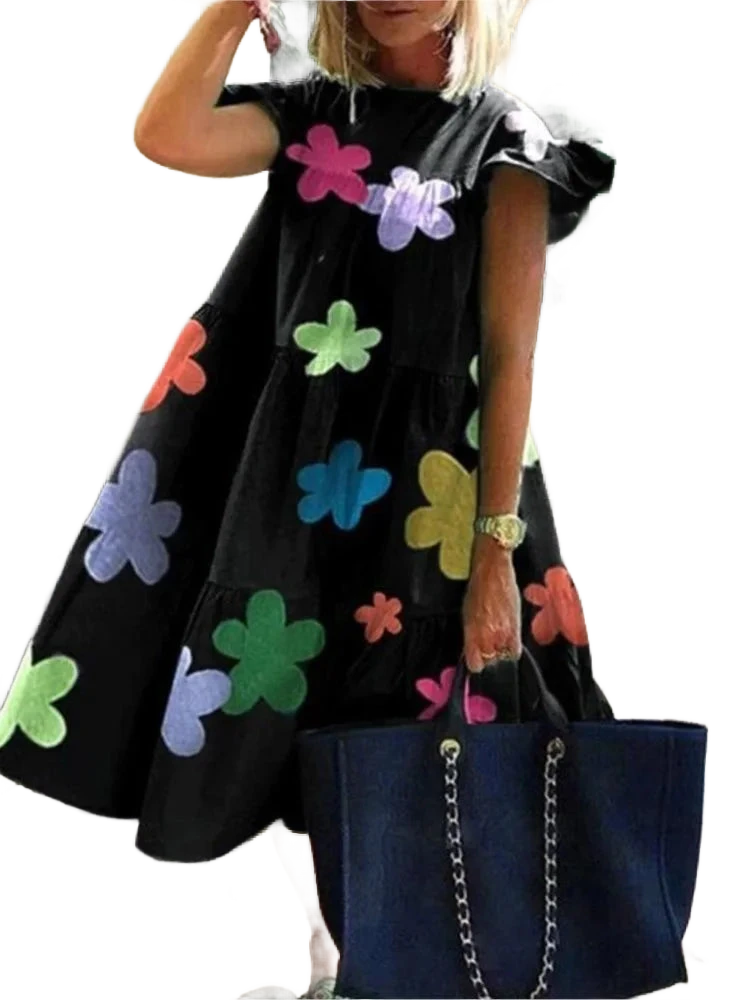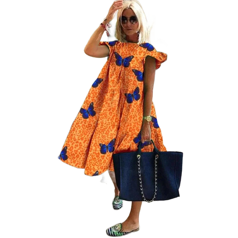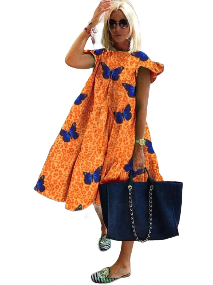 השמלה מעוצבת בקו משוחרר ונעים למגע, עם הדפס בוהו קייצי שמוסיף אופי וקסם. הגזרה המחמיאה מעניקה תחושת חופש, בעוד הרפרפות הקטנות מוסיפות טוויסט שובב שגורם לכל מבט להימשך אלייך.