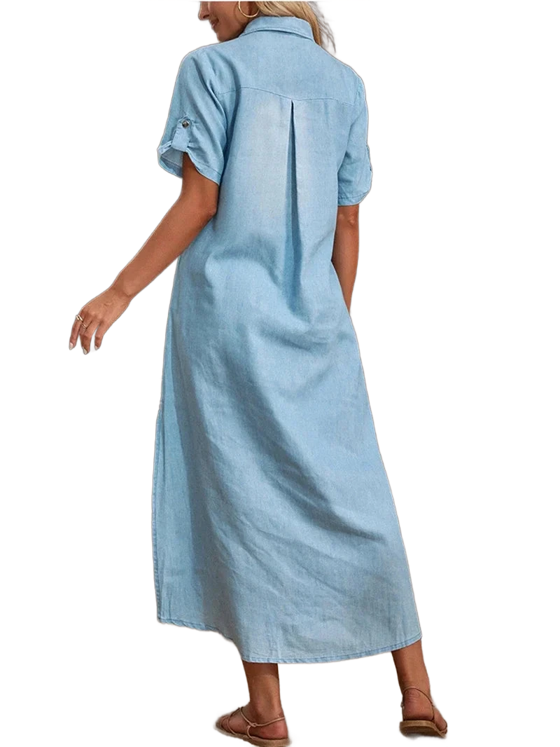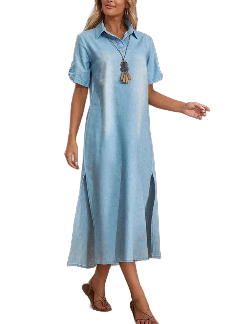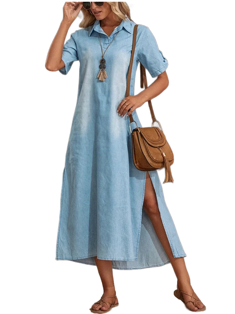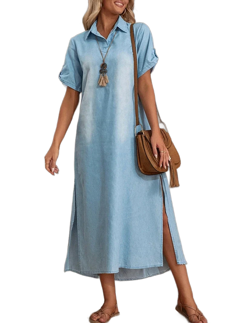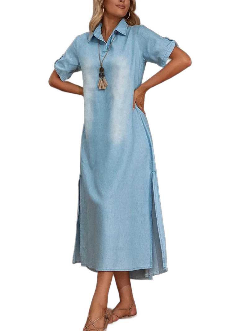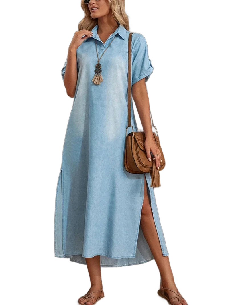 עשויה מבד ג'ינס קליל ונושם, עם גזרה ארוכה ומרשימה, שסע צדדי מחמיא ושרוול קצר – זו השמלה שמעניקה לך את החופש לנוע, לנשום ולהיראות מרהיבה בכל רגע.