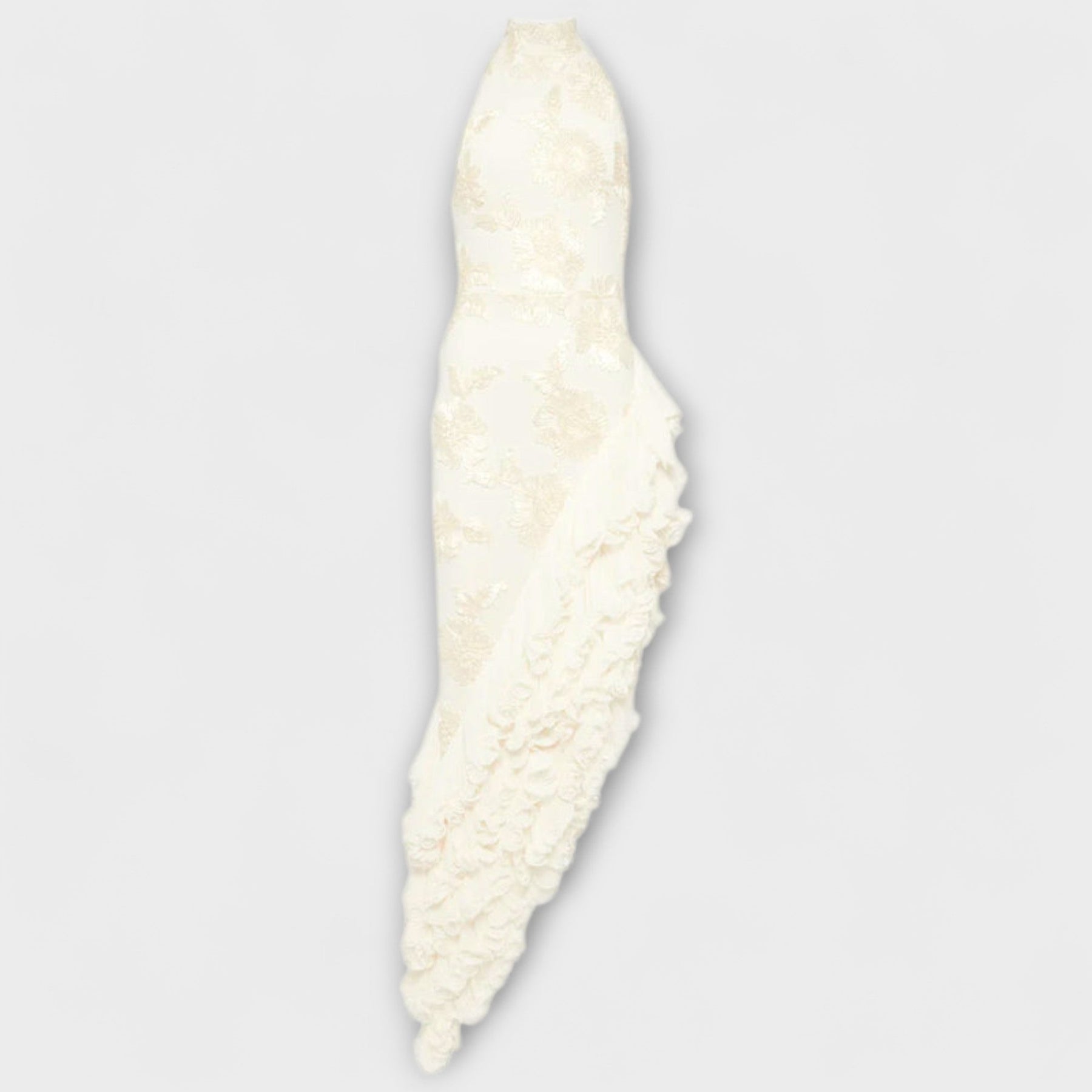 השמלה עשויה מבד נושם ורך, בעל תנועה טבעית וקלילה. רקמות הפרחים התלת־ממדיות נוצרו בעבודת יד עדינה, מוסיפות עומק ומגע של יוקרה. הגזרה נטולת שרוולים מעניקה חופש תנועה ואלגנטיות טבעית, בעוד שסגירת הרוכסן האחורית יוצרת קו גוף חלק ונקי. האורך המקסי יוצר תחושת זרימה ורומנטיות שאין שנייה לה – בדיוק כמו שהאישה של Miriam & Noa אוהבת.