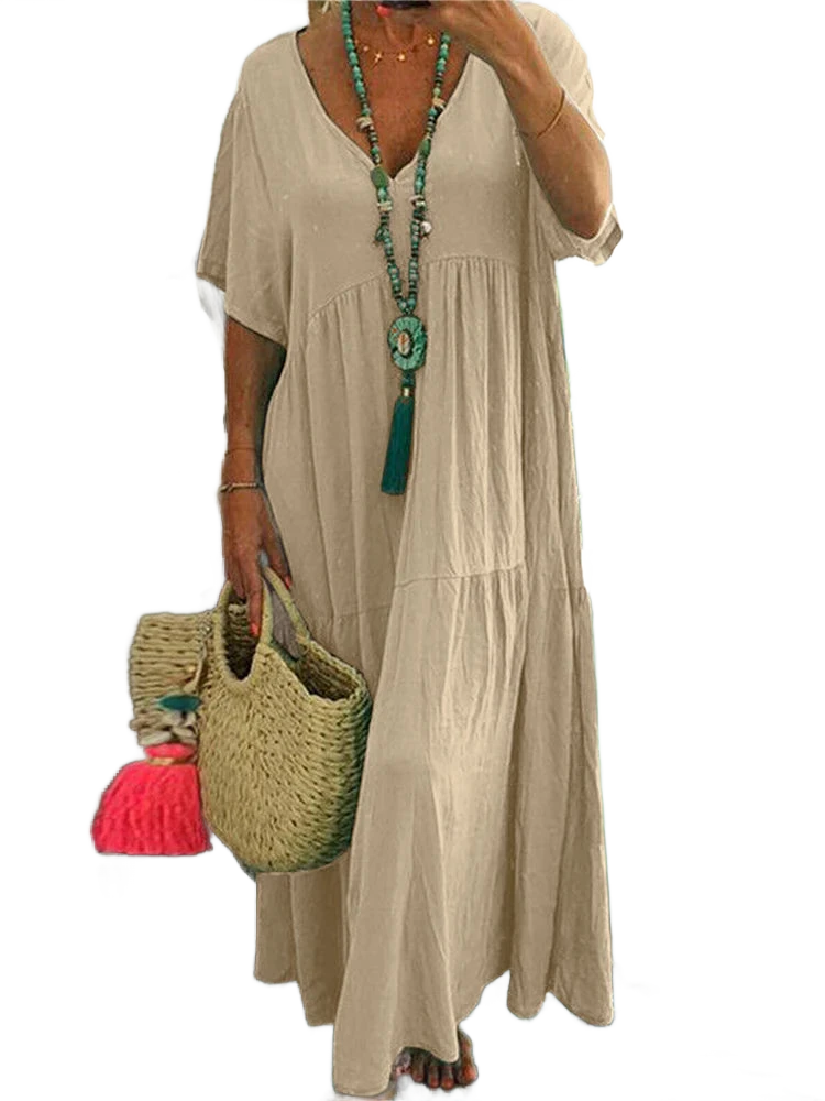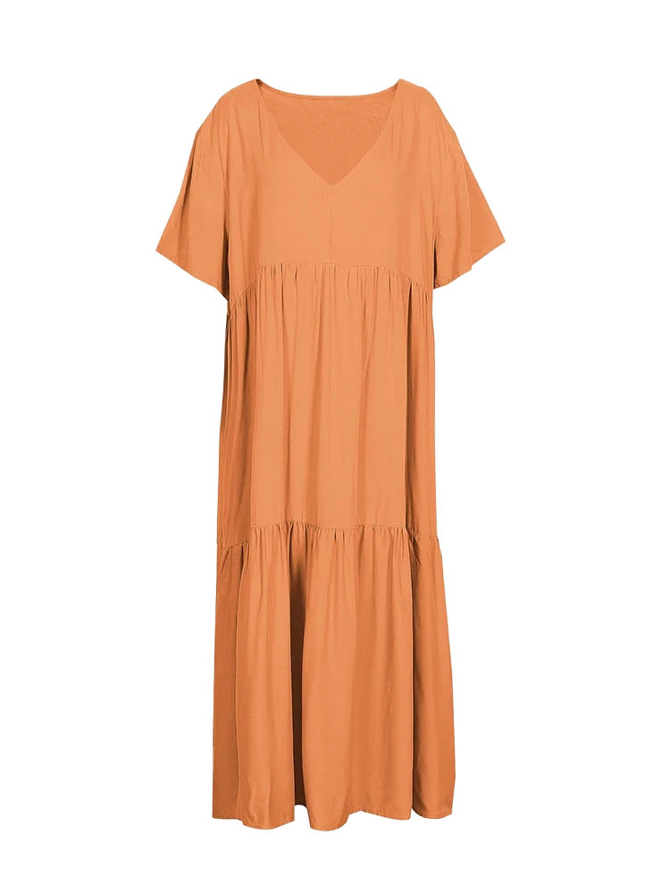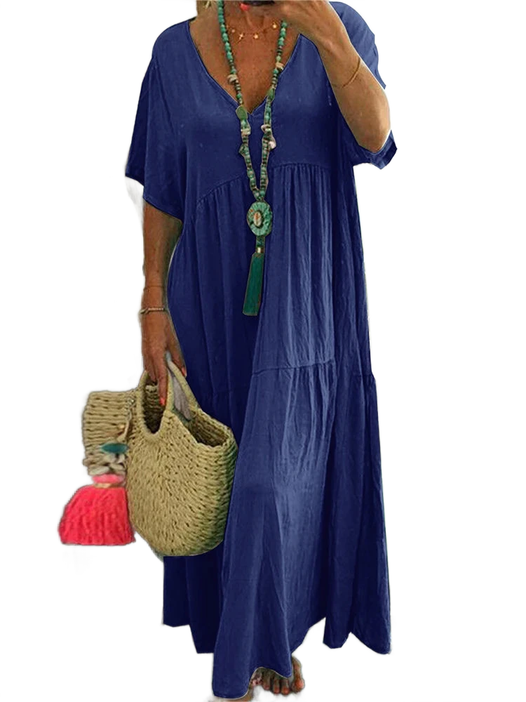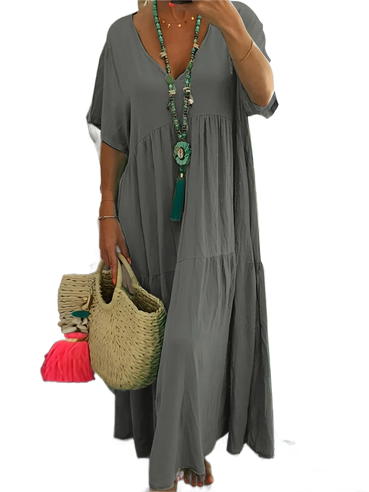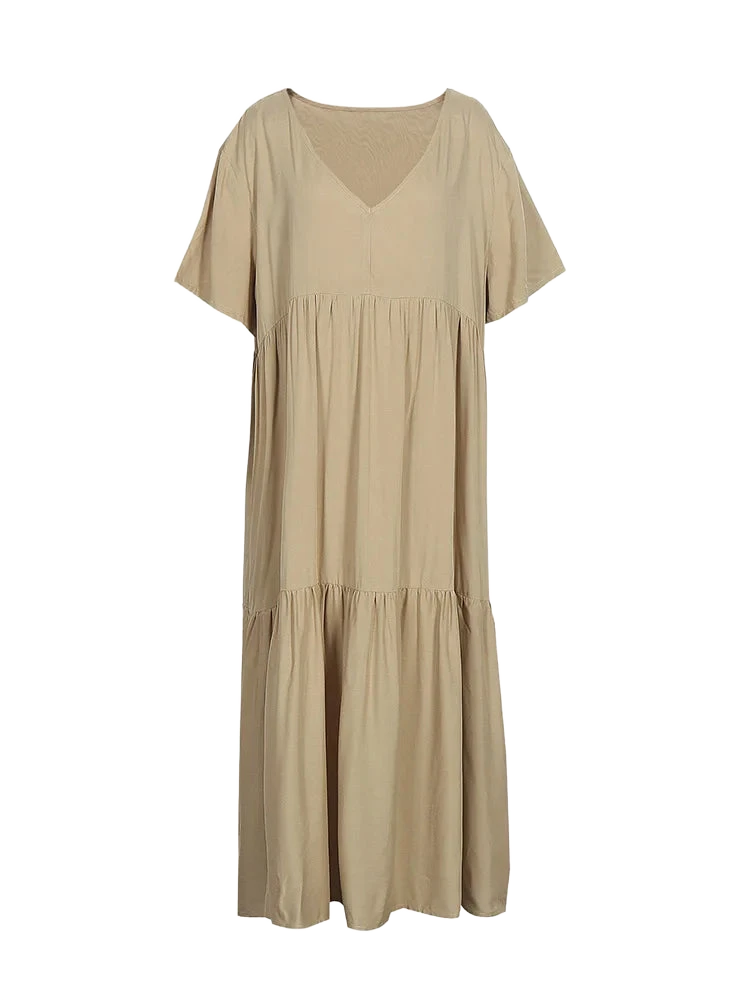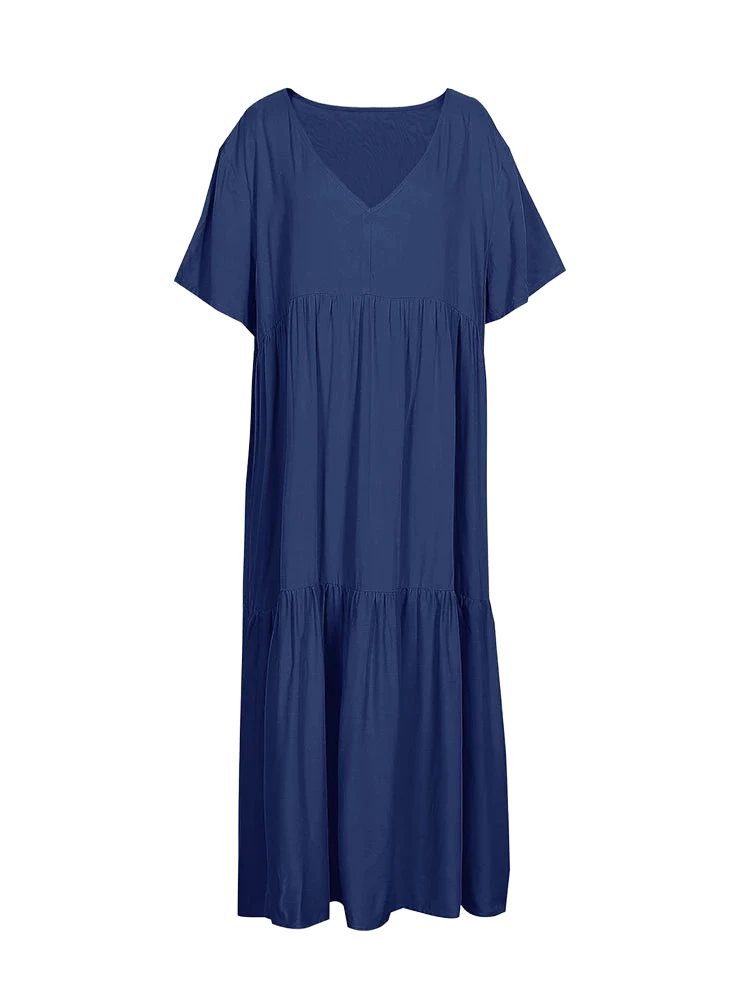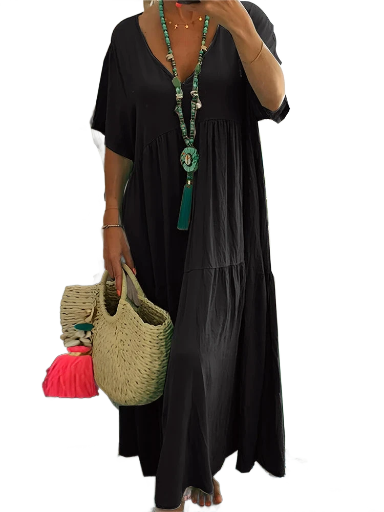 הגזרה המשוחררת והקלאסית משתלבת עם מחשוף V עדין וקפלים רכים שיוצרים מראה נשי, קליל ומדויק. זו השמלה שגורמת לאנשים להסתובב אחרייך – לא כי היא צעקנית, אלא כי היא פשוט מושלמת.