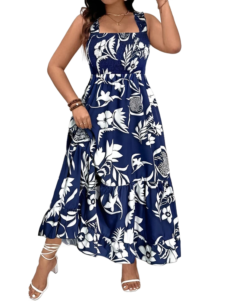 סגנון הולטר פרחוני עדין, חצאית עם שכבות רפלים, וחזית מקובצת יוצרים מראה רומנטי ומושך שמרגיש קליל ונעים לאורך כל היום. זו לא רק שמלה – זו חוויה של ביטחון עצמי, יופי ונוחות מושלמת.
