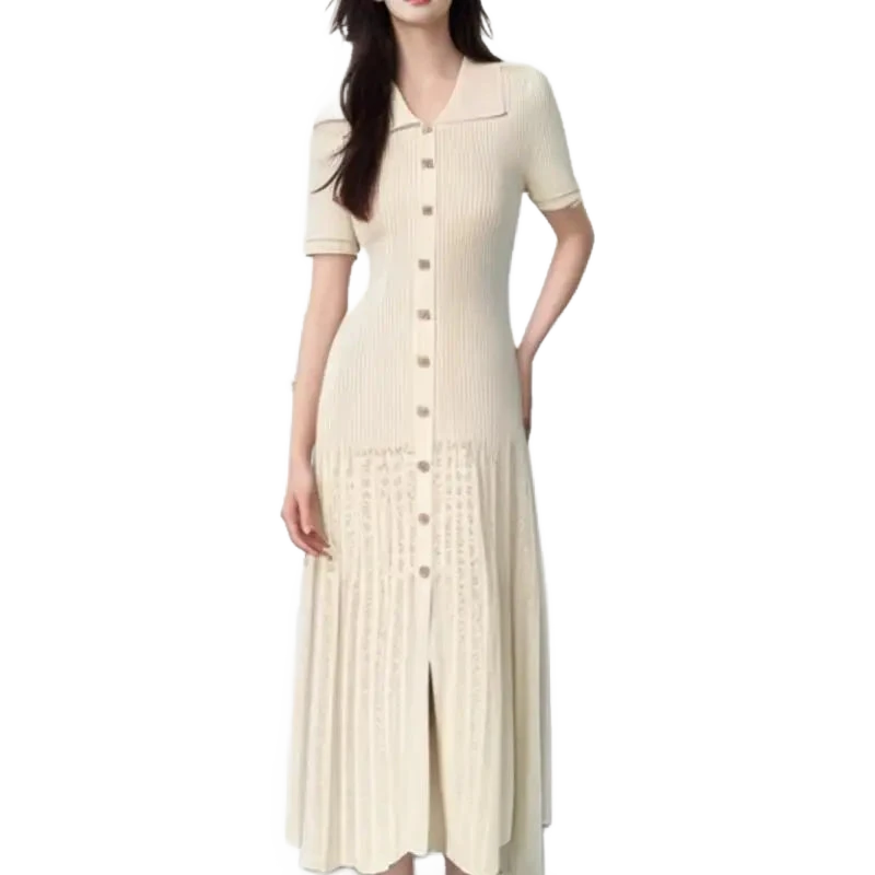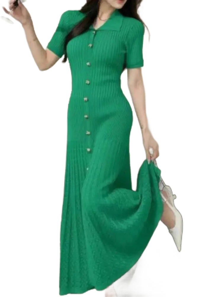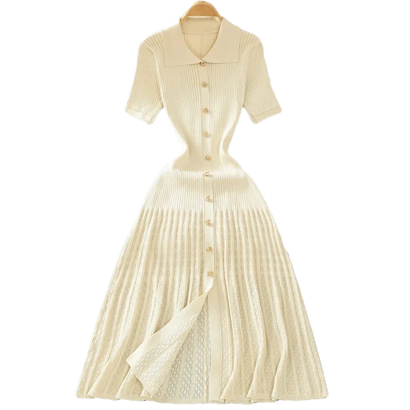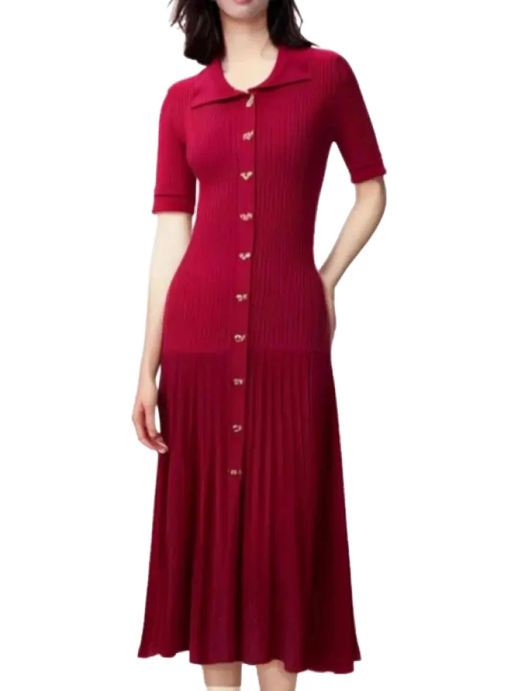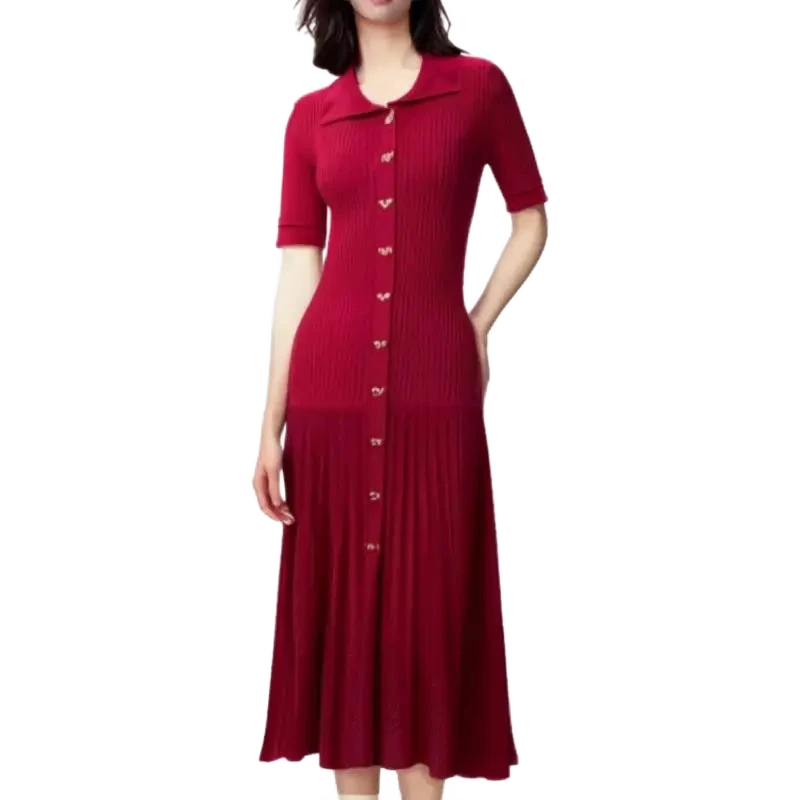 הבד הסרוג הקליל והקפלים המעוצבים מעניקים לשמלה מראה רך וזורם, בזמן שהגזרה הצמודה והכפתורים הקדמיים מוסיפים נגיעה קלאסית מתוחכמת.