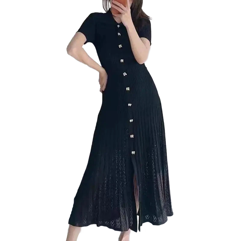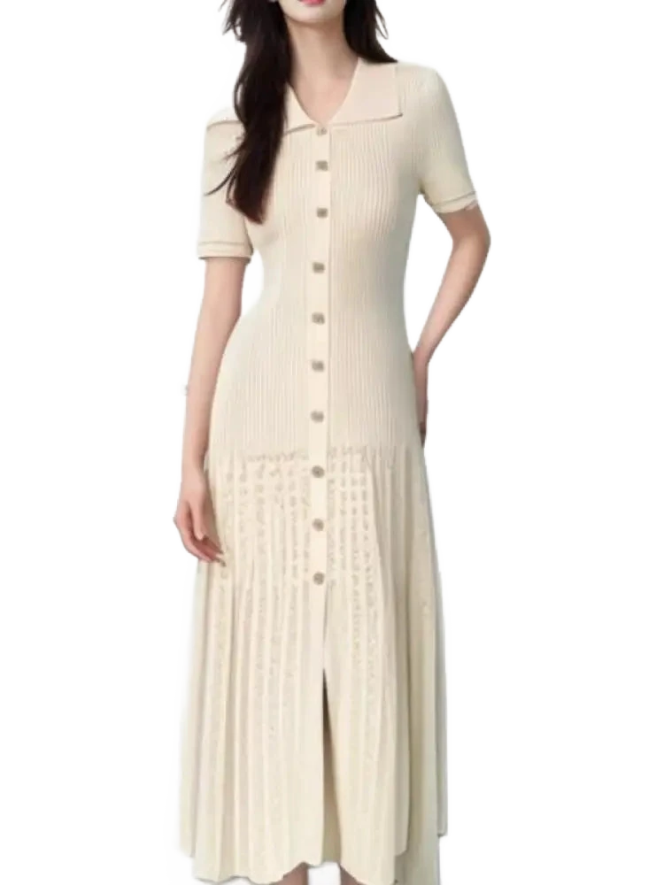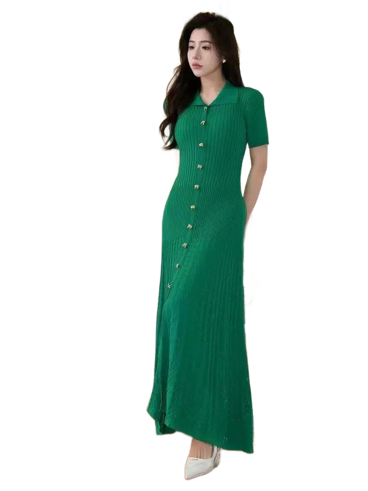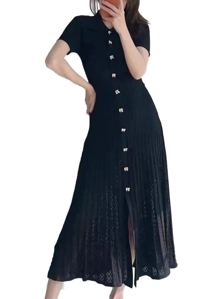 הבד הסרוג הקליל והקפלים המעוצבים מעניקים לשמלה מראה רך וזורם, בזמן שהגזרה הצמודה והכפתורים הקדמיים מוסיפים נגיעה קלאסית מתוחכמת.