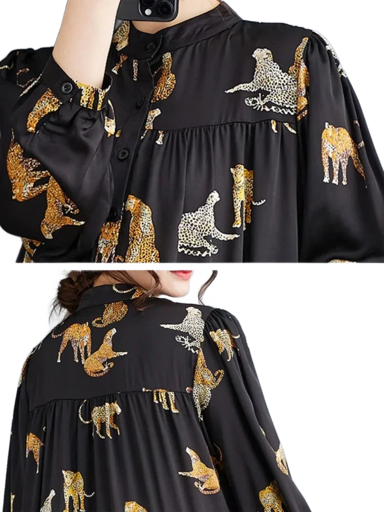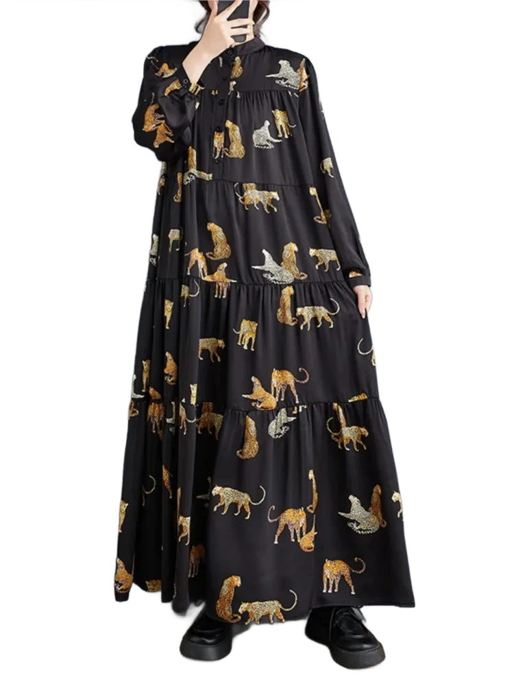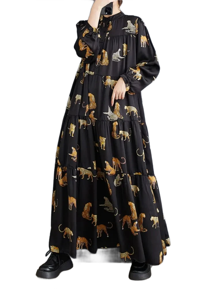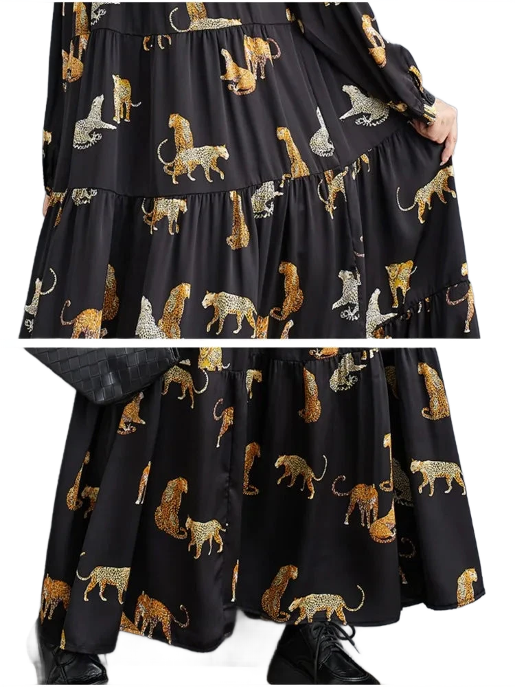 השמלה המעוצבת עם שרוולים ארוכים וגזרה מתרחבת יוצרת מראה נשי זורם שמחמיא לכל מבנה גוף. ההדפס החייתי המודרני מעניק נגיעה נועזת ואופנתית – בלי מאמץ מיותר.