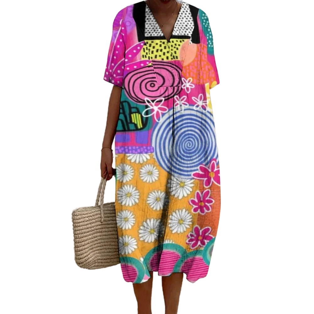 העיצוב הזורם עם צווארון V מחמיא ומרשים, מתאים גם ליום חם וגם לערב מיוחד על החוף או בעיר. זוהי שמלה שמאפשרת לך להיות בדיוק את מה שאת – אישה חופשייה, בטוחה, ומלאת סטייל.