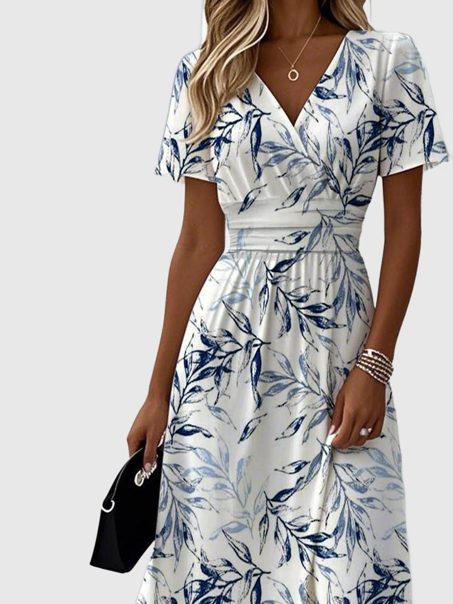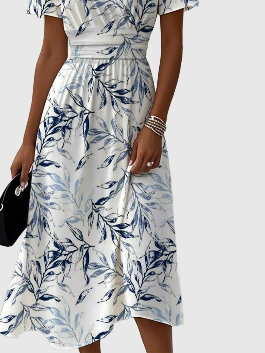 ✅ הדפס טבע מרהיב – עלים בגווני כחול רכים יוצרים תחושה של שלווה ורומנטיקה. ההדפס משתלב בצורה מושלמת עם האופי הנשי והאלגנטי של השמלה.