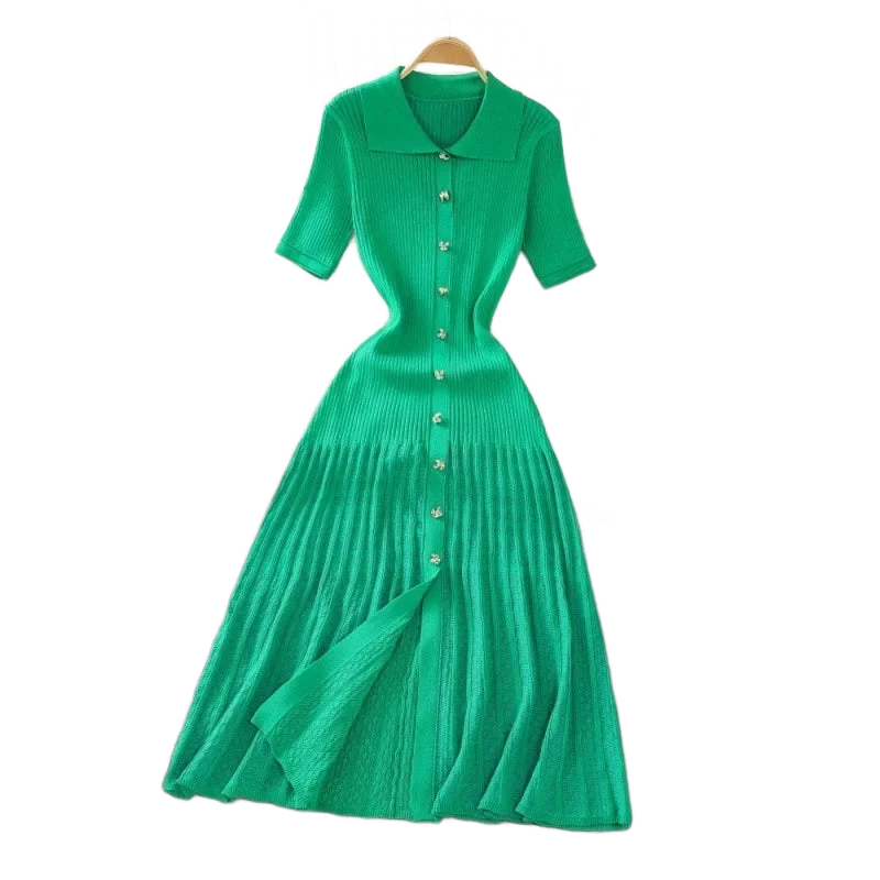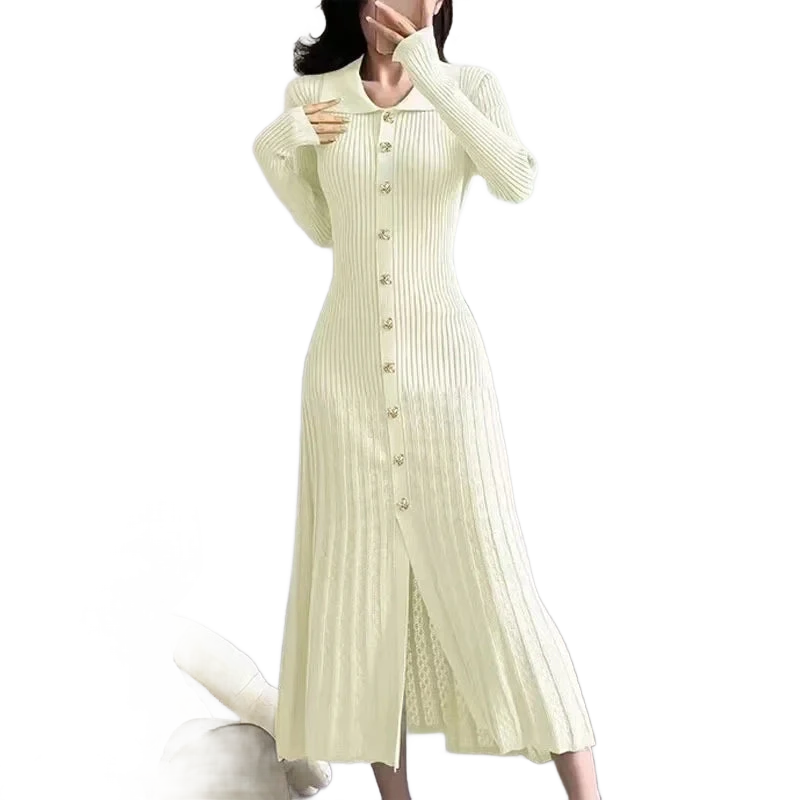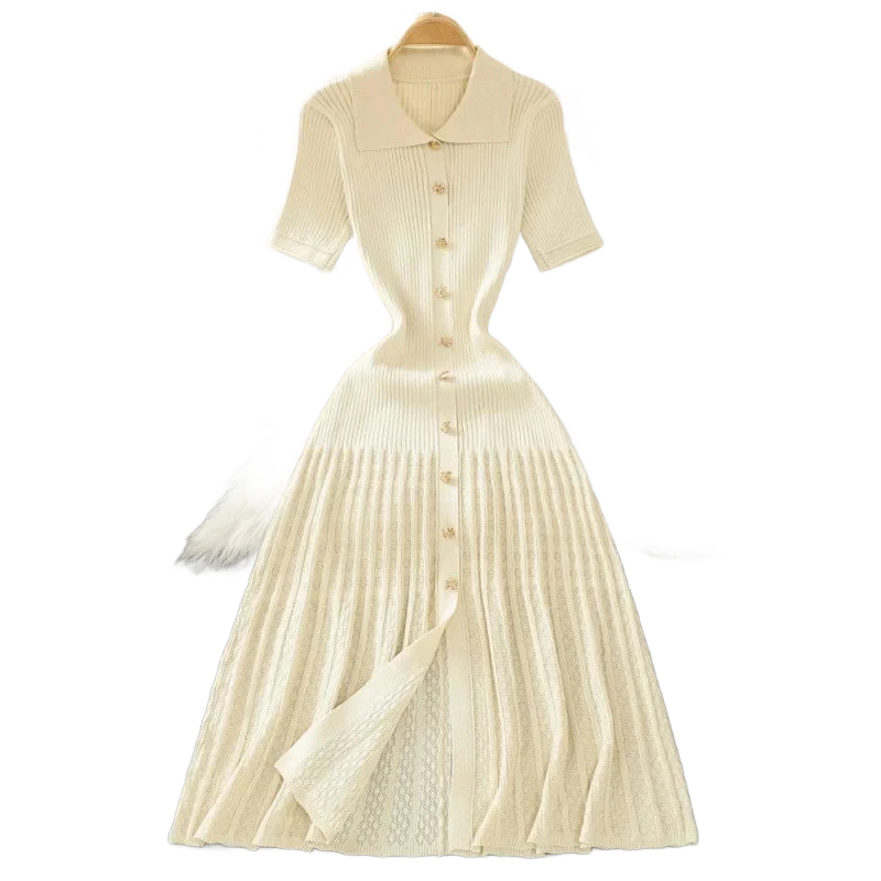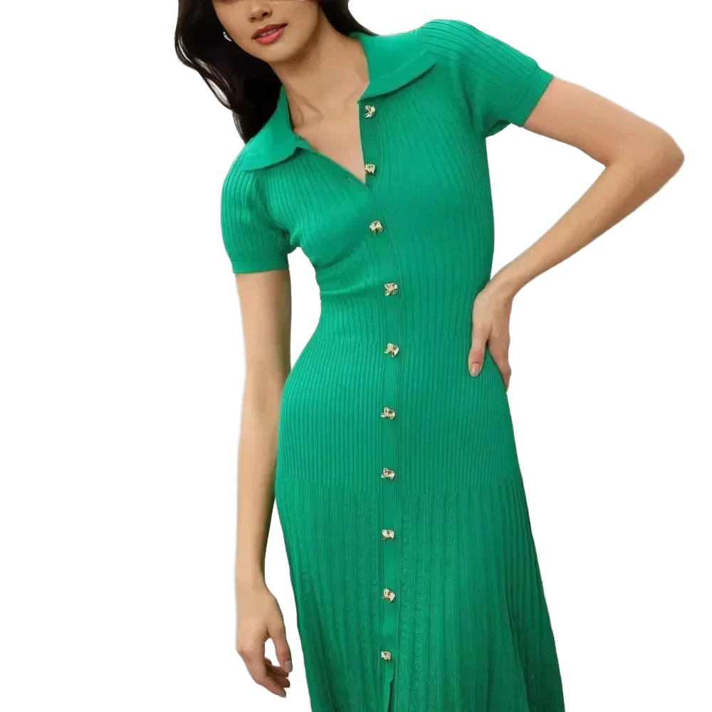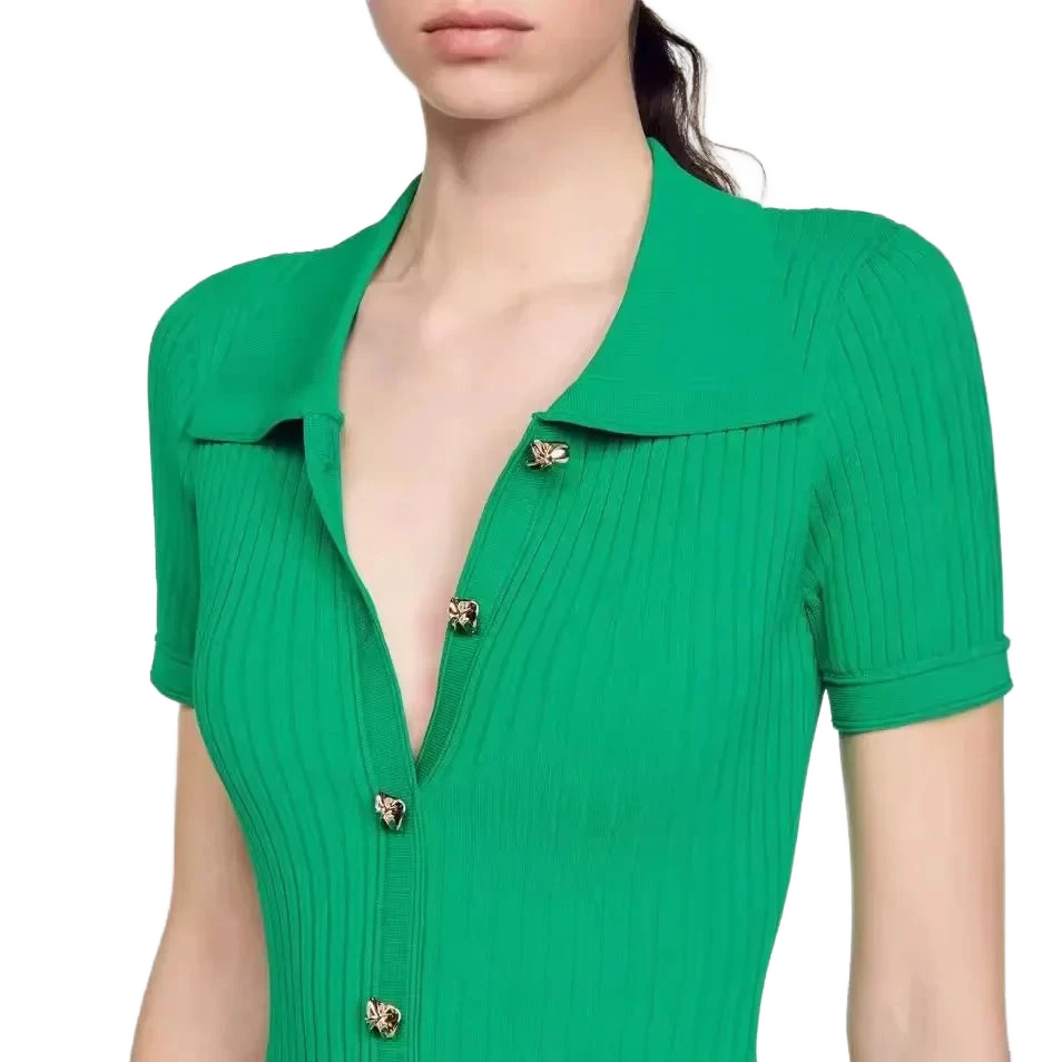 עיצוב עם צווארון פולו אלגנטי, כפתור מוזהב זוהר, וסריג מחטב שמלטף את הגוף – כל פרט נבנה כדי לגרום לך להרגיש בלתי נשכחת.