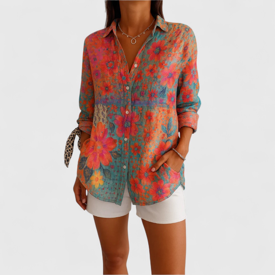 צאו למסע אל האלגנטיות הנצחית עם חולצת הפרחים הווינטג'ית ג'ואן - שילוב מושלם בין קסם רטרו לבין תחכום מודרני. חולצה זו, שנועדה לשדרג כל תלבושת, מוסיפה חן, ביטחון ורומנטיקה לסגנון היומיומי שלך.